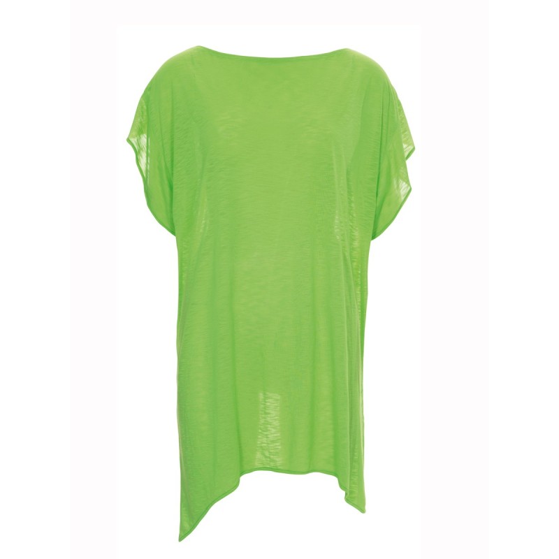 Блуза з найтоншого крепдешину оздоблена вздовж вирізу горловини і бортів контрастною бейкою. У бокових швах - невеликі розрізи. Пишні рукави-реглан зі складками на плечах і широкими манжетами приховують зайву повноту рук.