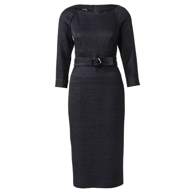 Приталена сукня-футляр з фігурним вшивним поясом, який підкреслює талію.