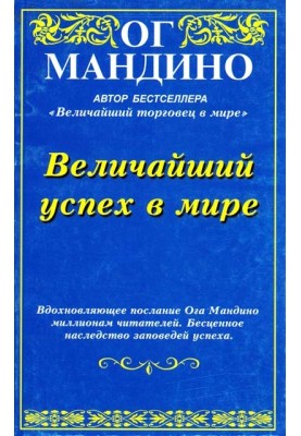 "Величайший успіх в світі" – це книга-посібник, яка допоможе вам змінити своє життя до кращого. Автор цієї книги, Ог Мандіно, відкриває перед читачем секрети успіху через пригоди та відкриття головного героя. Ця книга вчить нас, як змінити своє сприйняття світу, шляхом позитивного мислення та віри в себе. Вона надихає до саморозвитку, прагнення до досягнень та призводить до важливих відкриттів у власному житті. Відчуйте глибокий зміст книги "Величайший успіх в світі" та станьте авторами своєї власної історії успіху!